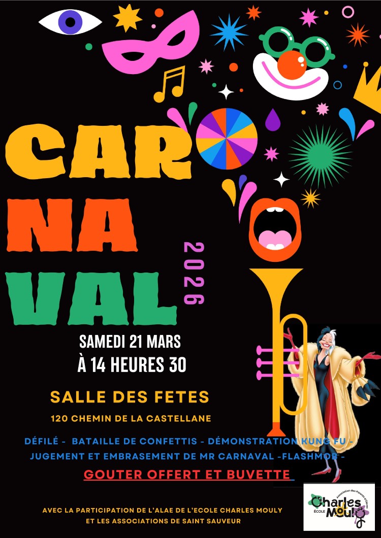 Le Carnaval est organisé le Samedi 21 mars 2026 par l'association des Parents d'Élèves de l'école Charles Mouly, avec la participation de l'ALAE de l'école Charles Mouly et les associations de Saint-Sauveur.