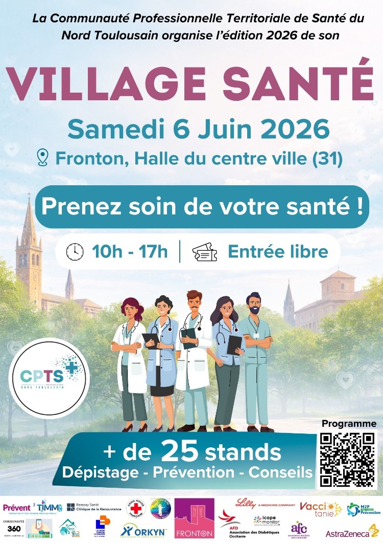 🎉La CPTS Nord toulousain organise un événement de santé publique, le « village santé » le samedi 6 juin 2026 à la Halle du centre-ville de Fronton.