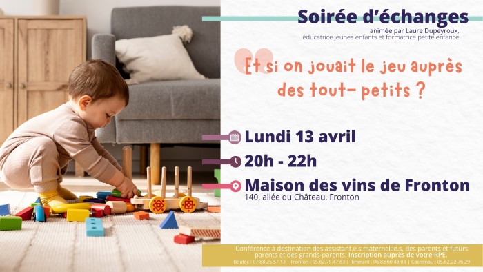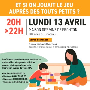 Le Relais Petite Enfance de la Communauté de Communes du Frontonnais organise cet évènement à la Maison des Vins de Fronton pour les parents, grands-parents, assistantes maternelles, accompagnateurs jeunesse-éducation concernés par le développement des tout-petits jusque trois ans.